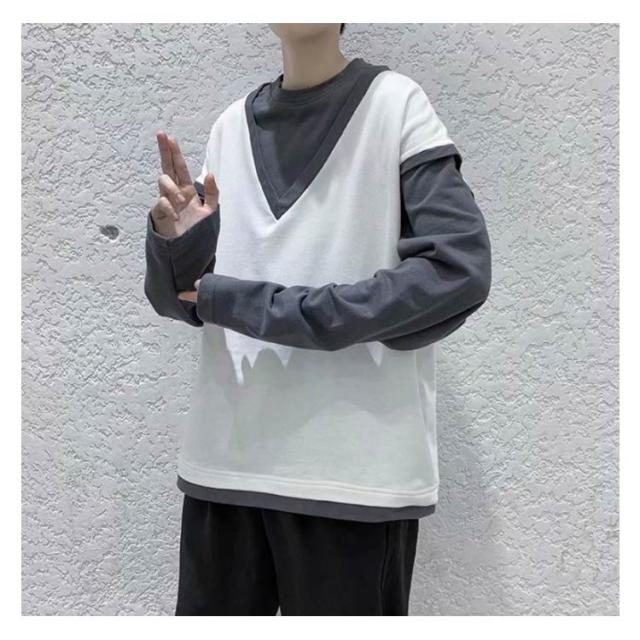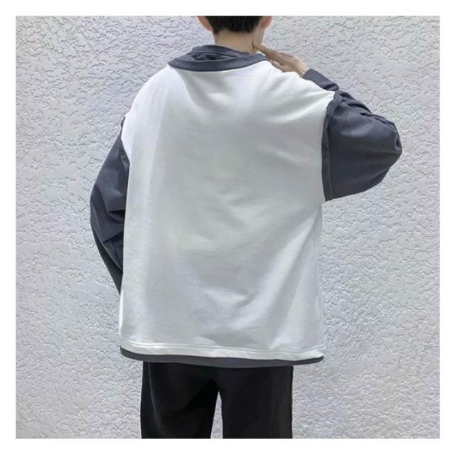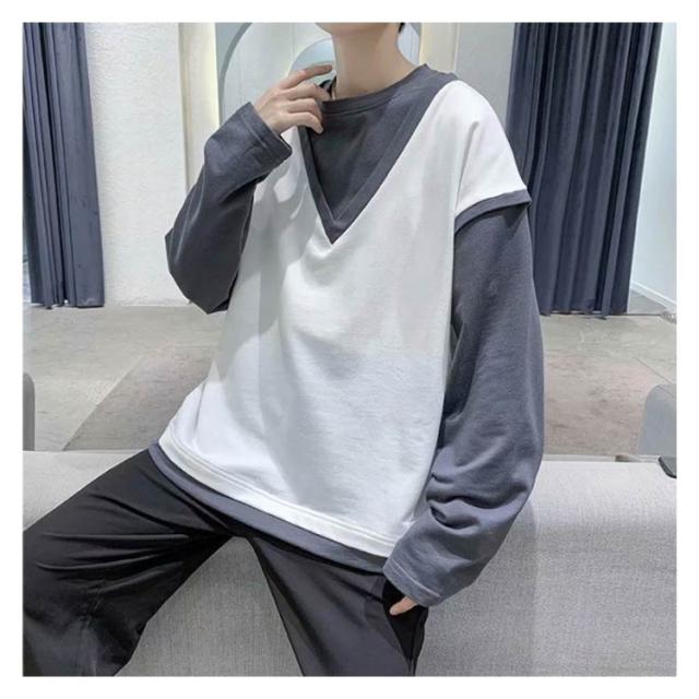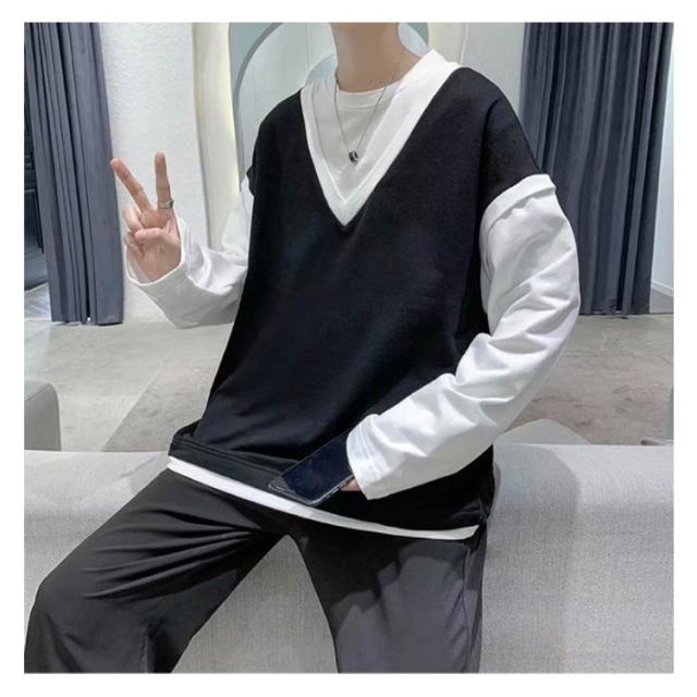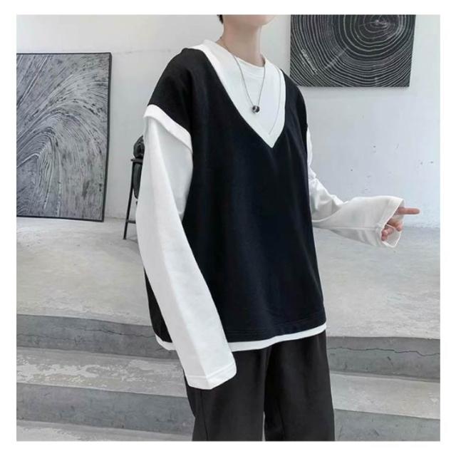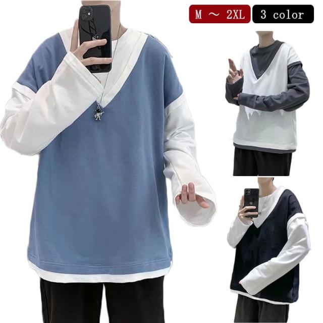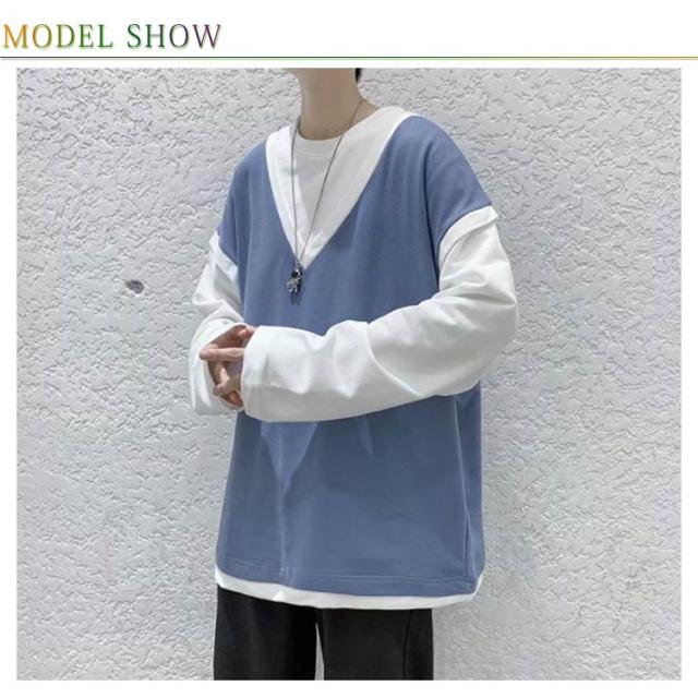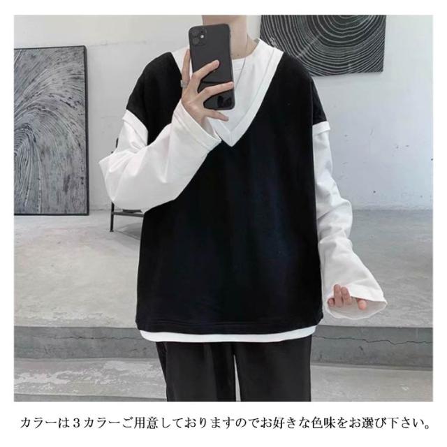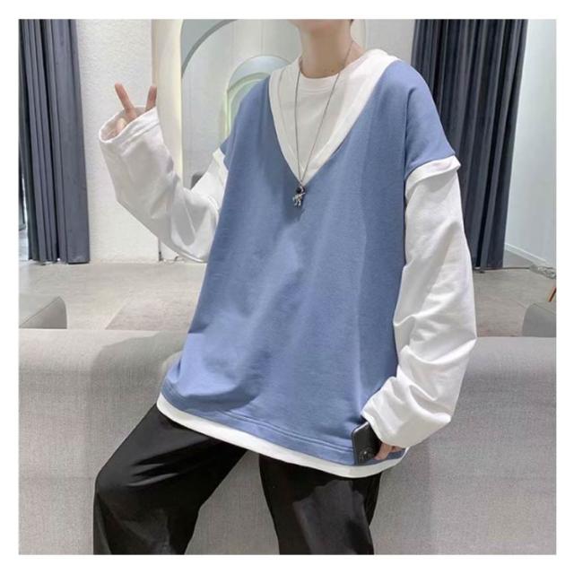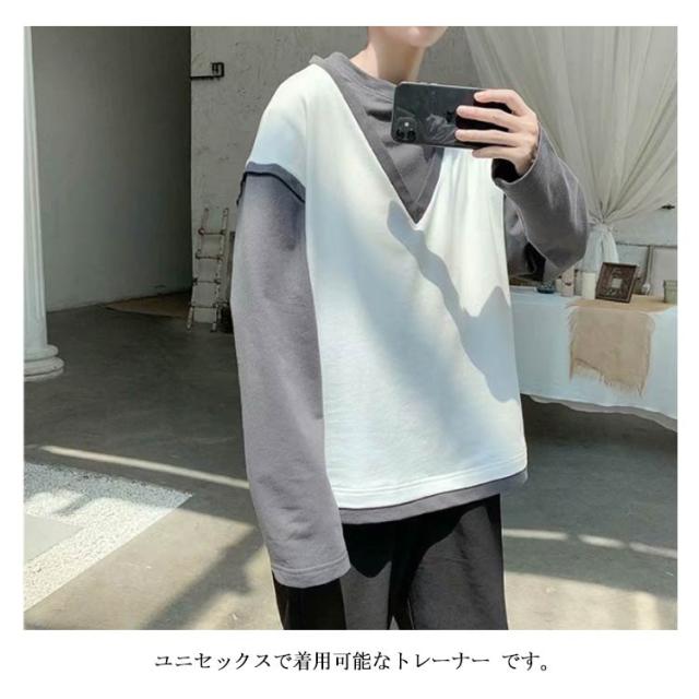 トレーナー メンズ 韓国 原宿 ストリート オルチャン 無地 重ね着 オーバーサイズ ビックシルエット ゆったり レディース ファッション 古着 ストリート系 カジュアル 古着 トレーナー 大きめ 切り替え vネック グルネック