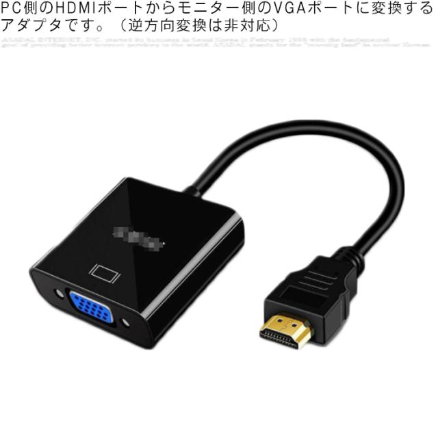 | PC側のHDMIポートからモニター側のVGAポートに変換するアダプタです。(逆方向変換は非対応) これを使うだけで、簡単にパソコンに保存してある映像をVGA対応の大画面のテレビに映し出せます。 VGAは音声伝送非対応ですので、音声の出力は信号出力元のPCからとなります。 | |