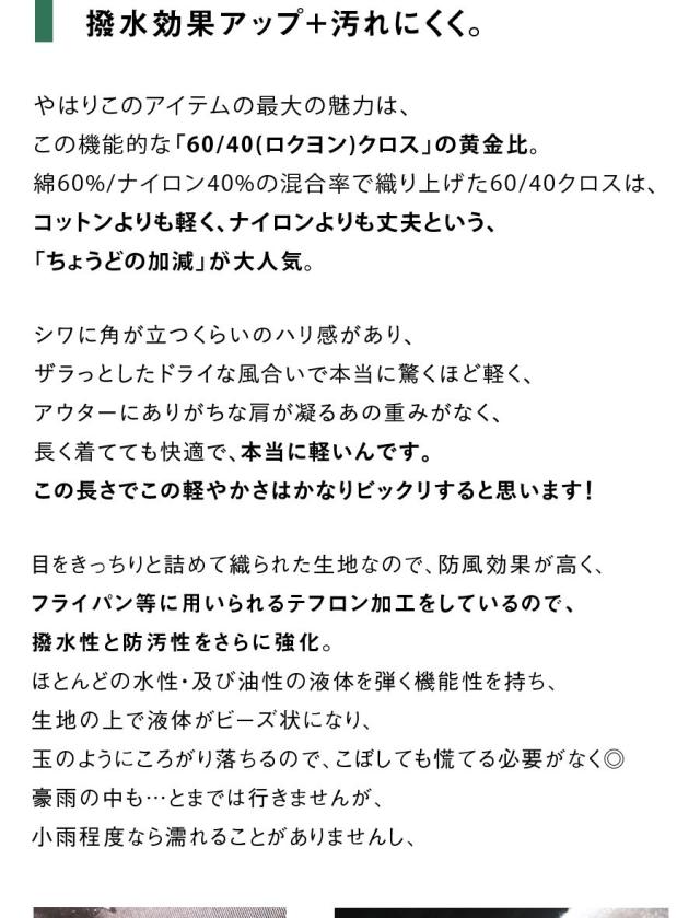 ・軽量で、撥水・防風効果のある『60/40(ロクヨン)クロス』。