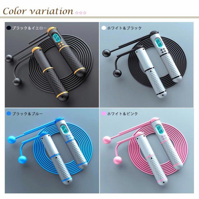 | (高精度計測&LED表示パネル)この縄跳びがタイマー、跳び回数、体重とカロリーはLED液晶画面で明らかに表示され、タイマー、消費カロリー、跳び回数状況が全部示られます、運動効果がわかりやすいです。そして、体重とタイマーセットして、消費カロリーが自動計算出来ます。運動量を把握して、毎日続けることで手軽に体力づくり健康維持ができます。 (2way跳び式) このなわとびには、ロープレスボールが2個付属しており、室内なら、コードレスで跳ぶことができます。室外はロープがありモードで使用できます。場所を取る煩わしさがありません。この縄跳びはいつでもどこでもフィットしていることに興味がある人に良いものです。 (取り外し可能な重りを内蔵)グリップ部に内臓された100gの着脱可能な重りで、これをつけて、運動負荷をさらに高めることができます。普通の縄跳びよりも体脂肪の燃焼効果がアップです!トレーニング、筋トレ、ダイエット、フィットネスに適する。競技、有酸素スポーツ運動にも不可欠になります。収納袋付き、簡単に持ち運べ、いつでもどこでも運動を楽しむことができます。 (長さ調節可能ロープ)ロープの長さが300cmで、長さが簡単に調節できるため、あらゆる身長に適しています。余分な長さを切り取って余長なロープをガッチリ固定することはできます。縄跳びはワイヤーロープの設計で、外側にはPVC素材のシースがあり、従来の製品より弾性、強度、耐衝撃性に優れていますので、各種類のフローリングで使っても安心できます。 (スムーズに回転のボールベアリング)高品質なボールベアリングが搭載されているので、高速で安定かつスムーズな回転を保証し、運動中のスピードと快適さは一層向上になります。組み込みの高品質のボールベアリングにより、ロープはねじれたり、曲がったりことが防止しできます。グリップにはEVAスポンジ素材を採用し、滑りにくくなり、手触りは快適です。 | |