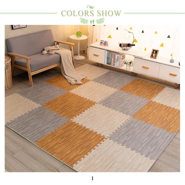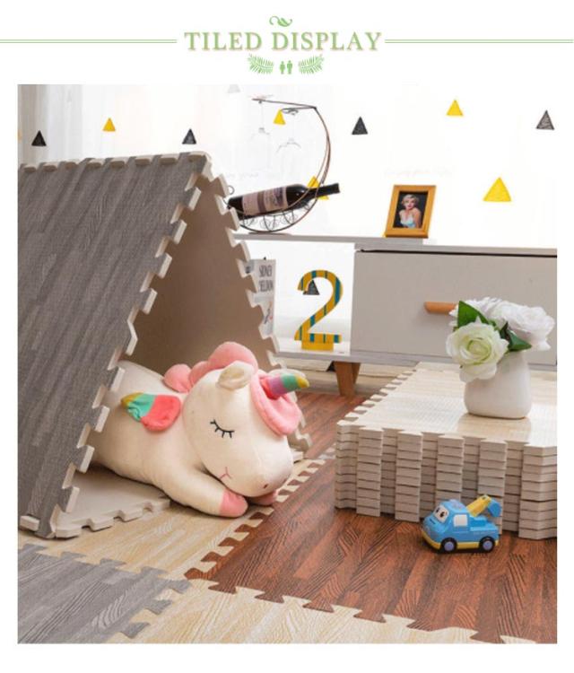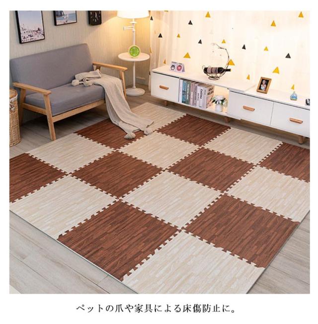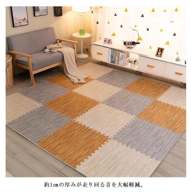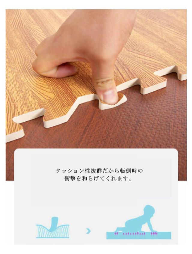 | 温かみのある木目調ジョイントマット。 クッション性抜群だから転倒時の衝撃を和らげてくれます。 約1cmの厚みが走り回る音を大幅軽減。 ペットの爪や家具による床傷防止に。 床の冷たさも和らげてくれます。 ジュースやよだれをこぼしてもサッと拭けちゃいます。 | |