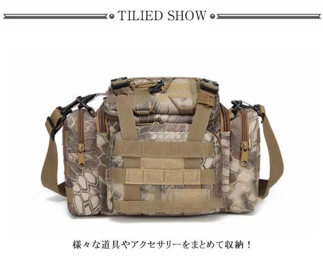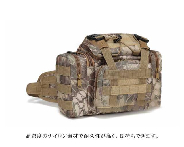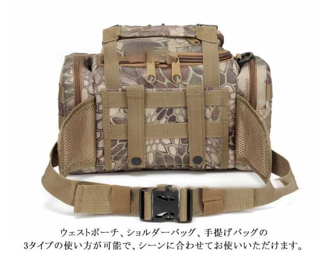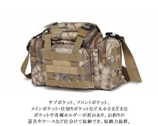 | 広く開けてものの出し入れが楽チンの多機能フィッシングバッグ。 様々な道具やアクセサリーをまとめて収納!サブポケット、フロントポケット、メインポケット・仕切りポケットなど大小さまざまなポケットや各種ホルダーが沢山あり、お釣りの道具やケースなど仕分けて収納でき、収納力抜群。 高密度のナイロン素材で耐久性が高く、長持ちできます。 ウェストポーチ、ショルダーバッグ、手提げバッグの3タイプの使い方が可能で、シーンに合わせてお使いいただけます。 いつも小物を多く持ち歩く方には普段使いにもピッタリのミリタリーバッグです。 | |