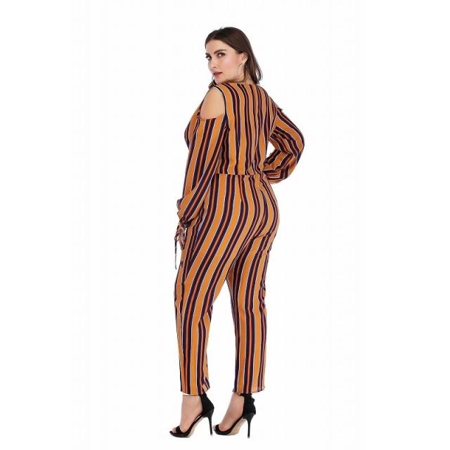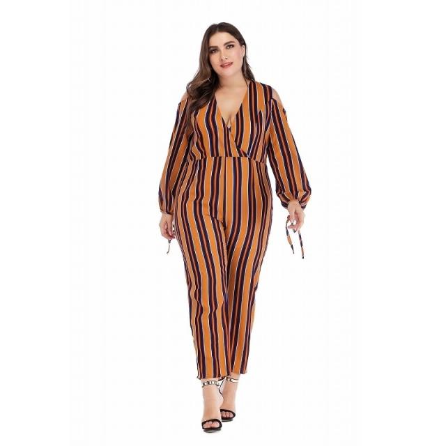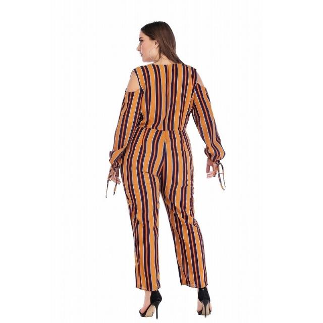 オールインワン ジャンプスーツ サロペット レディース 長袖 ロングパンツ カシュクール パンツドレス 肩だし 肩開き 肩見せ ストライプ 袖リボン