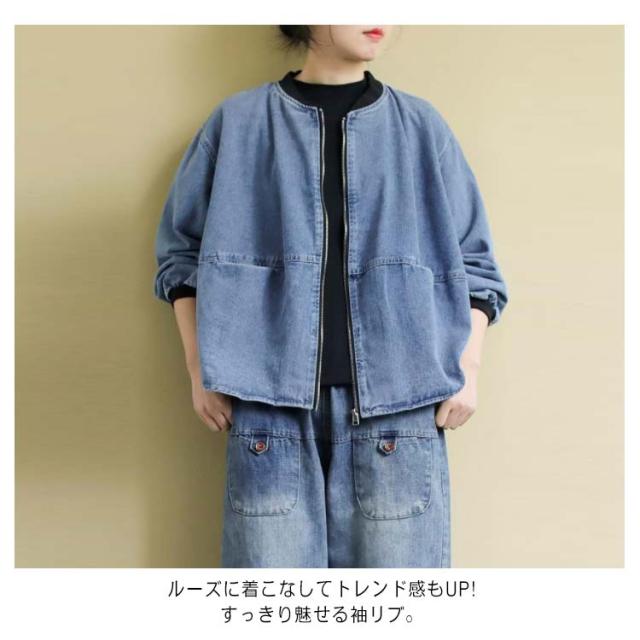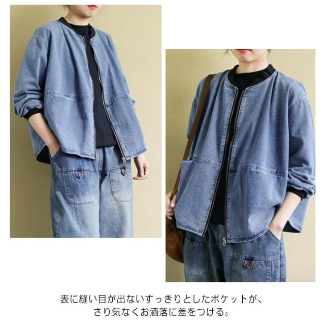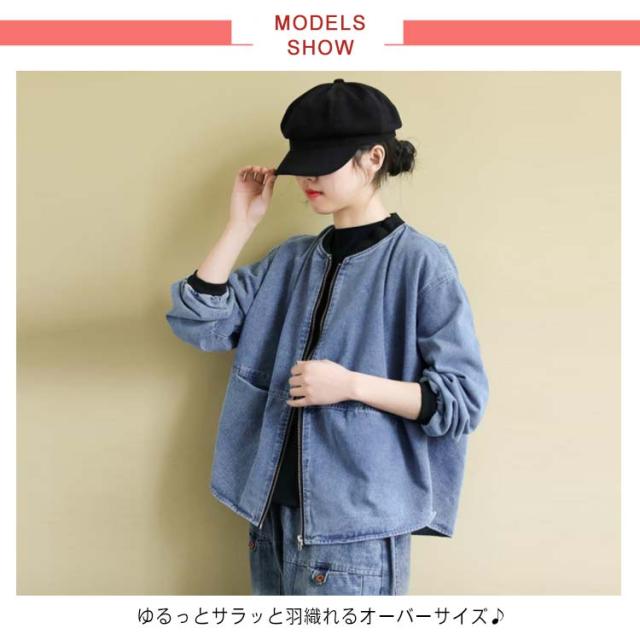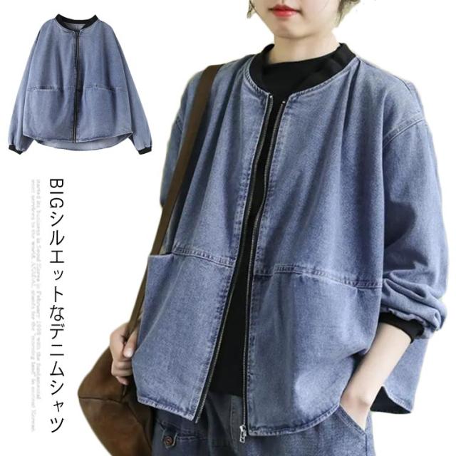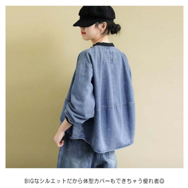 デニムジャケット レディース 送料無料 長袖 10分袖 ノーカラー ラウンドネック ドロップショルダー オーバーサイズ 体型カバー ゆったり カジュアル アウター ルーズ 大きいサイズ 大きめ BIG