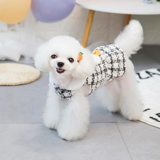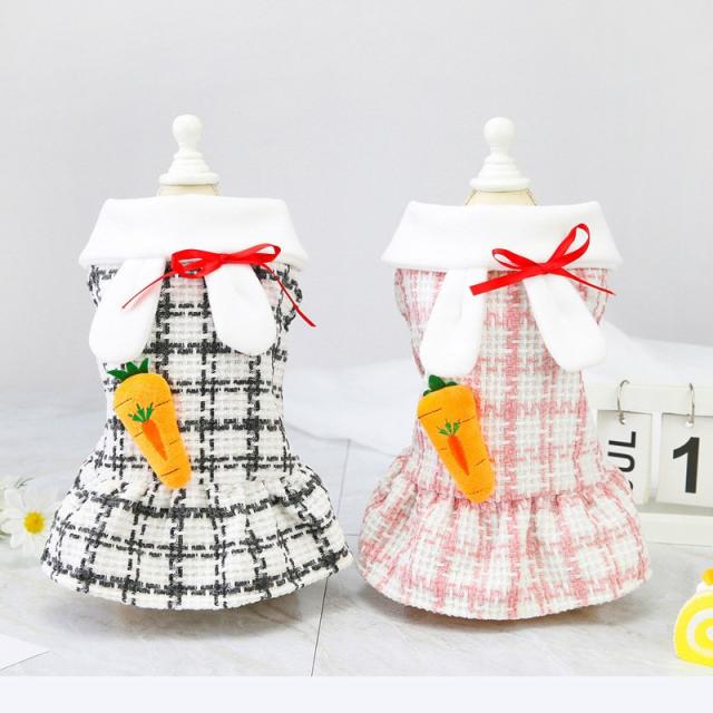 ドッグウェア ワンピース 犬服 猫服 ペット用品 小型犬 袖なし チェック ツイード風 うさぎ うさ耳 にんじん マスコット リボン フレアスカート