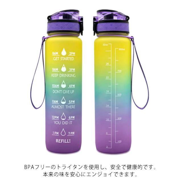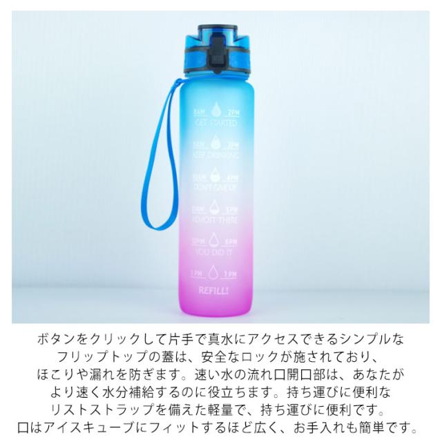 | 持ち運びに便利:1000mlのストロー付きスポーツウォーターボトルは、車やバイクにもすっぽり収まります.1リットルの容量ですが、ちょうど夕方に飲みきるサイズ。 デザインが優れる:ボタンをクリックして片手で真水にアクセスできるシンプルなフリップトップの蓋は、安全なロックが施されており、ほこりや漏れを防ぎます。速い水の流れ口開口部は、あなたがより速く水分補給するのに役立ちます。持ち運びに便利なリストストラップを備えた軽量で、持ち運びに便利です。口はアイスキューブにフィットするほど広く、お手入れも簡単です。 BPAフリー:BPAフリーのトライタンを使用し、安全で健康的です。本来の味を安心にエンジョイできます。 使用温度:耐熱温度は-10℃〜90℃.(本製品はトライタンプラスチックを使用しています,したがって保温・保冷機能はありませんのでご注意ください) | |