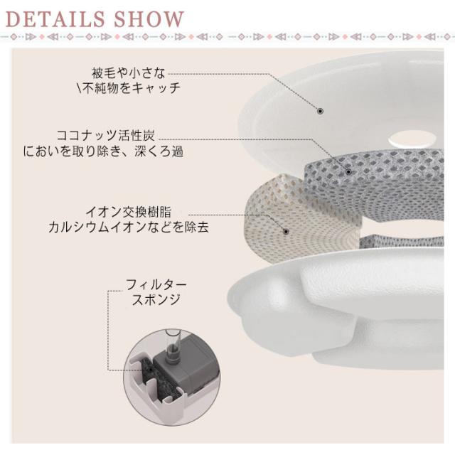 | フィルタ一システム 水に含まれる余分なカルシウム?マグネシウムを除去します。愛猫?愛犬に常にキレイで美味しい水を飲んでもらえます。 猫の抜け毛対策 広げるアーク表面は毛やホコリ?ごみをフイルタ一に吸着させて、より清潔でキレイなお水を保ちます。 分離式デザイン 取付簡単、給水便利。 超静音 夜間の寝室や、小さなお子様がいるご家庭でも安心してご使用できます | |