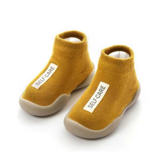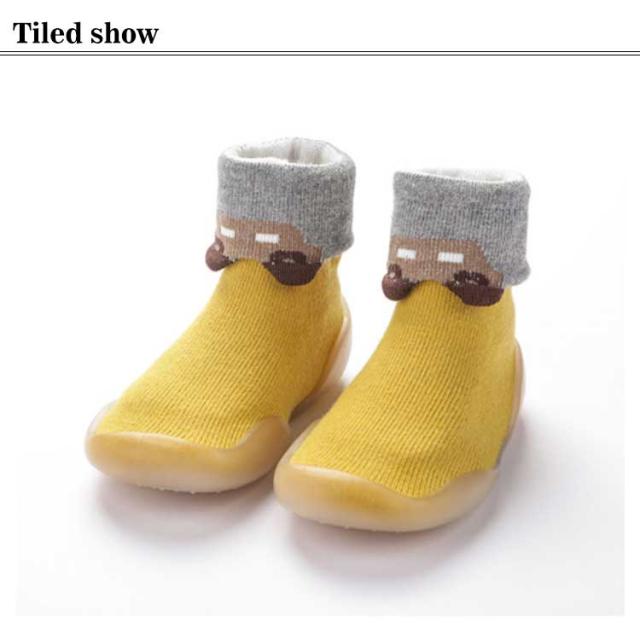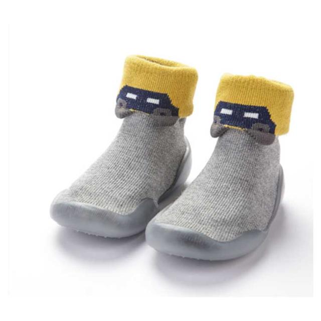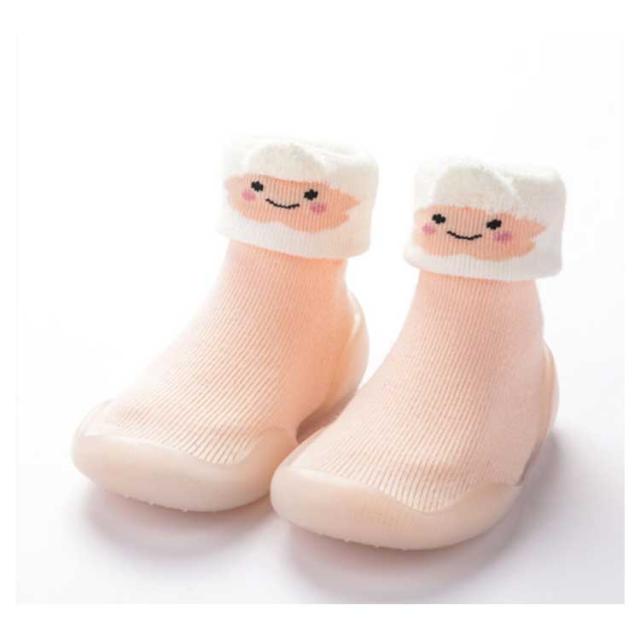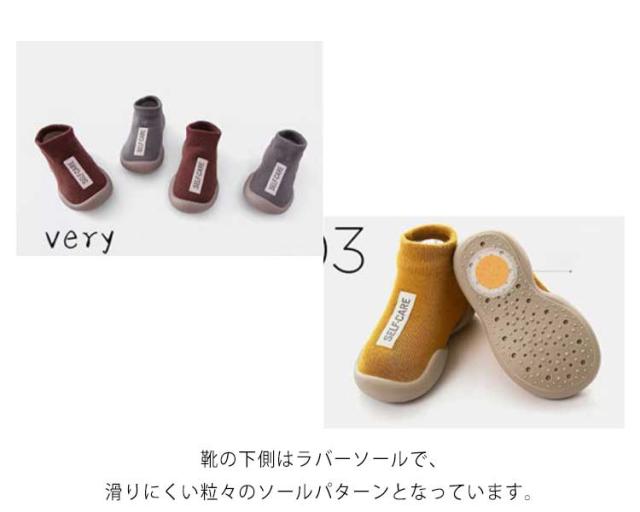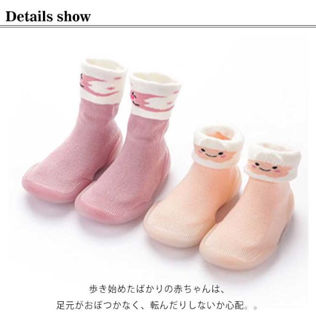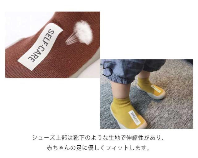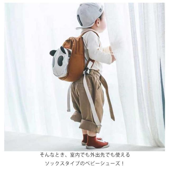 | はいはいを卒業する時期の歩き方練習中のお子様に是非はいていただきたいファーストシューズです。 素足に近い感覚ではじめての靴に違和感が少なく、履きやすくなっています。 歩き始めたばかりの赤ちゃんは、足元がおぼつかなく、転んだりしないか心配。。 そんなとき、室内でも外出先でも使えるソックスタイプのベビーシューズ! シューズ上部は靴下のような生地で伸縮性があり、赤ちゃんの足に優しくフィットします。 靴の下側はラバーソールで、滑りにくい粒々のソールパターンとなっています。 適度な柔らかさがあり、つま先の自由度が高く疲れにくくなっています。 靴を履くのを嫌がるお子様でも違和感なく履くことが出来ます。 | |