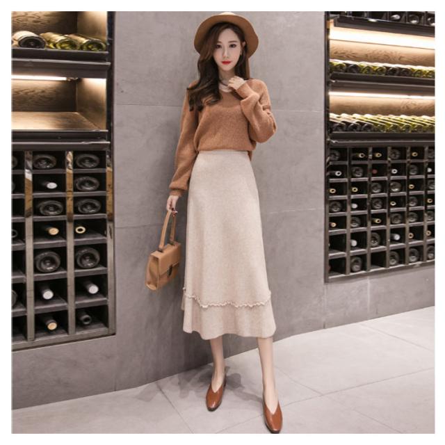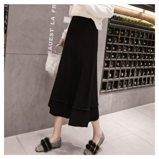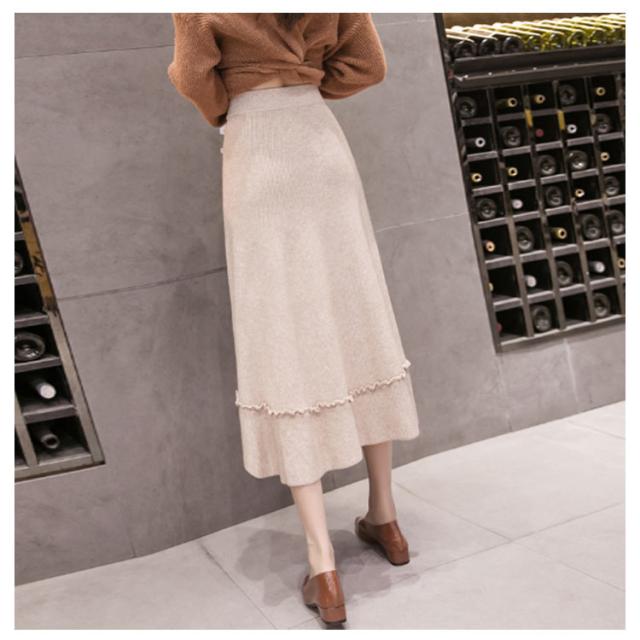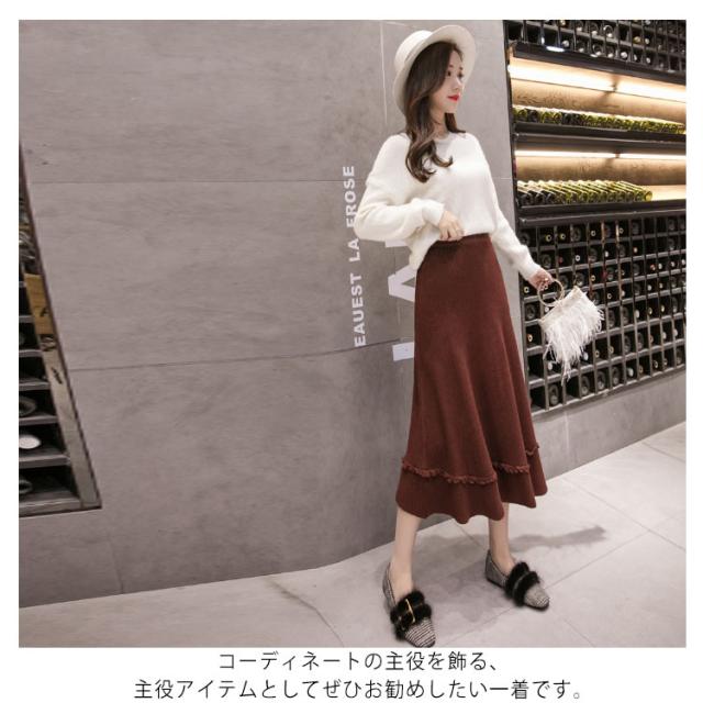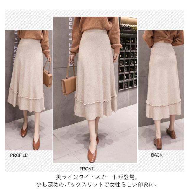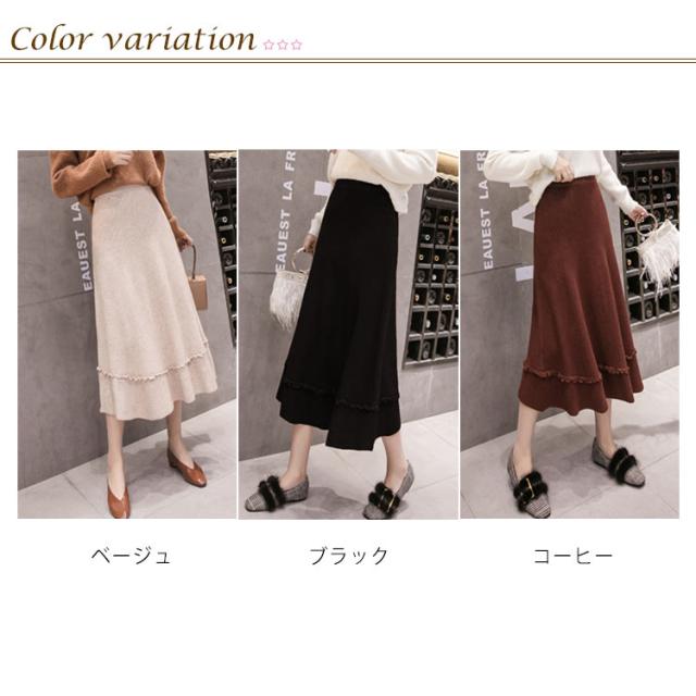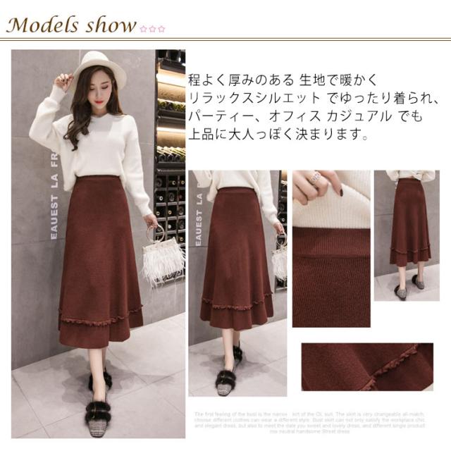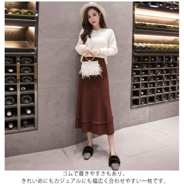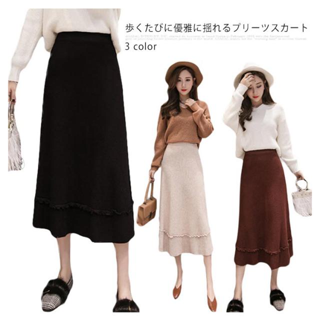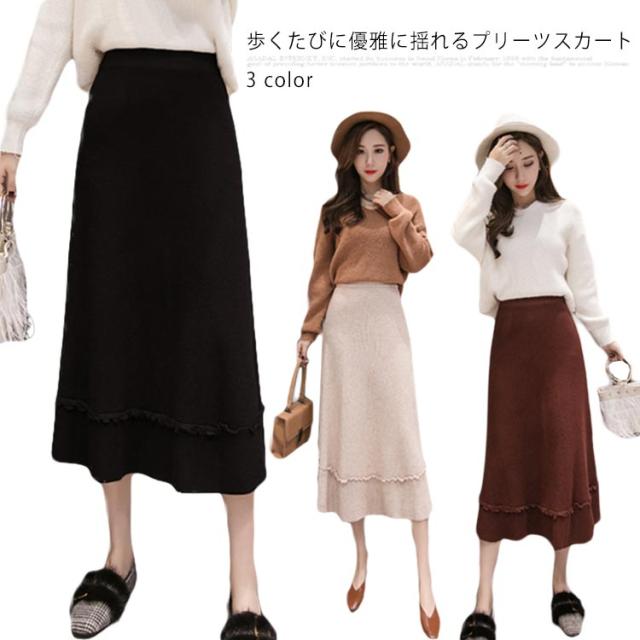 プリーツスカート ニットスカート ニット フレアスカート 秋冬 レディース スカート aライン ロングスカート リブ ロング丈 リブニット ハイウエスト 裾フリル ニットアップ リブニット ボトムス マキシ丈 着痩せ