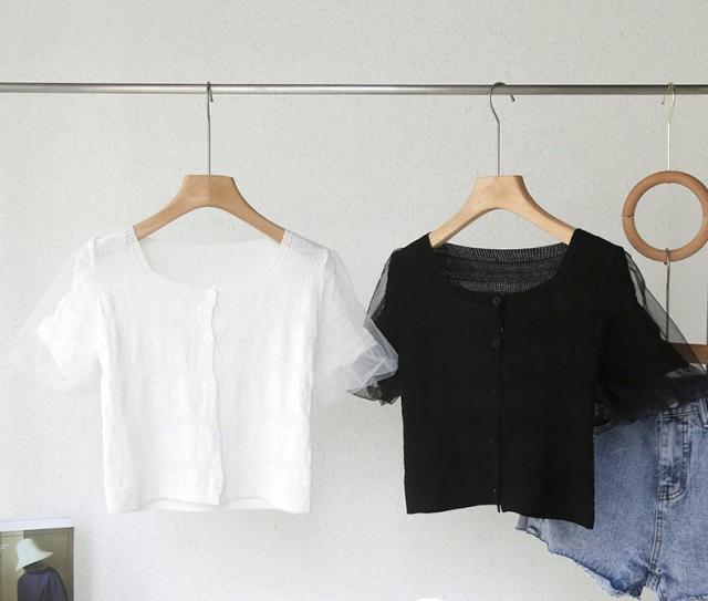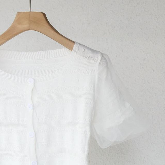 カーディガン ニット レディース 婦人服 半袖 スクエアネック 前開き チュールレース メッシュ ダイヤ柄 おしゃれ かわいい 羽織り トップス オフ