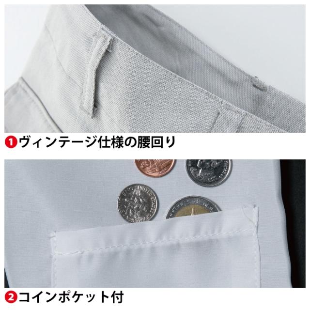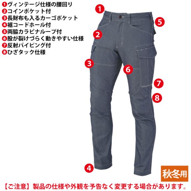 ◇ヴィンテージ仕様の腰廻り コインポケット 長財布も入るカーゴポケット 裾コードホール付 両脇カラビナ付 股が裂けづらく動きやすい仕様 ひざタック仕様 ひざ裏反射パイピング付