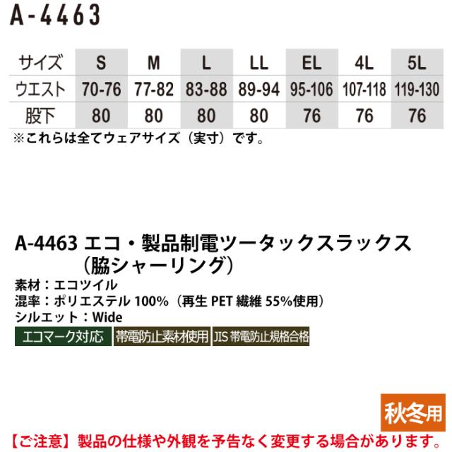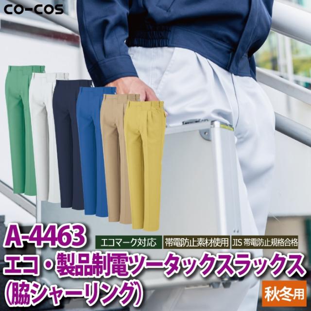 コーコス 作業服 秋冬用 A-4463 エコ製品制電ツータックスラックス(脇シャーリング) S-LL