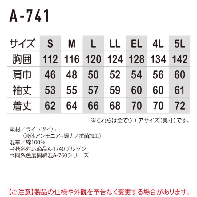 【A-741 抗菌防臭防縮長袖ブルゾン】