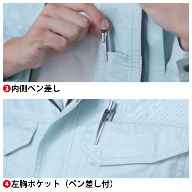 ◇アクションプリーツ(メッシュ)・携帯電話収納ポケット・内側ペン差し・左胸ポケット(ペン差し付)・左袖ペン差し・逆玉縁ポケット・裾アジャスター・樹脂穴ボタン・スタンドカラー着用可能