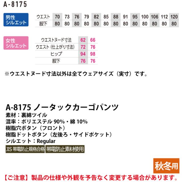 コーコス 作業服 秋冬用 A-8175 ノータックカーゴパンツ 62-85