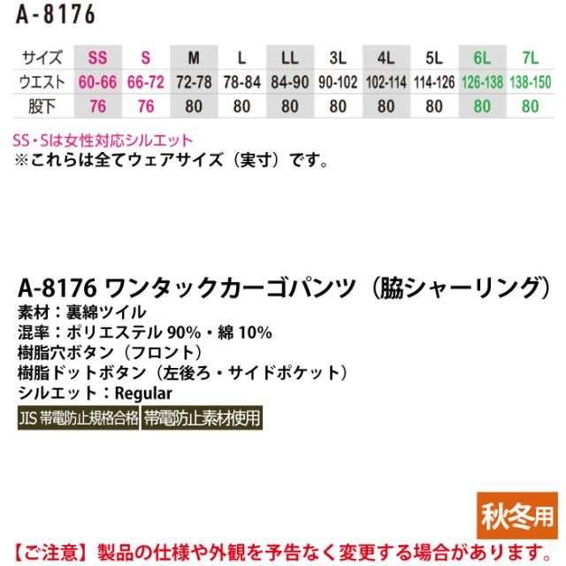 コーコス 作業服 秋冬用 A-8176 ワンタックカーゴパンツ(脇シャーリング) 4L-7L