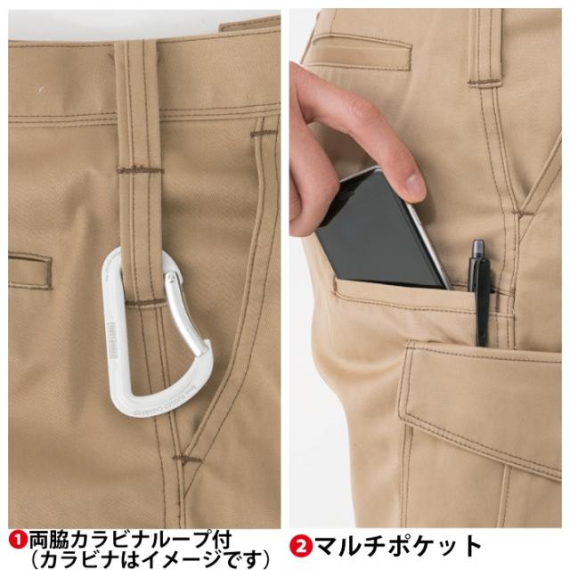 ◇JIS帯電防止規格合格・帯電防止素材使用・両脇カラビナループ付・マルチポケット・上からも入るスルポケ・右脇ポケット内側コインポケット・樹脂穴ボタン(フロント)・樹脂ドットボタン(左後ろ・サイドポケット)・男女兼用