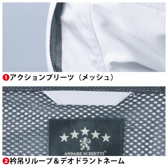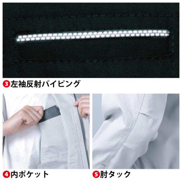 ◇JIS帯電防止規格合格・エコマーク対応・帯電防止素材使用・防汚加工・消臭効果・アクションプリーツ(メッシュ)・肘タック・衿吊りループとデオドラントネーム・左袖反射パイピング・内ポケット・樹脂ドットボタン・樹脂ファスナー・男女兼用