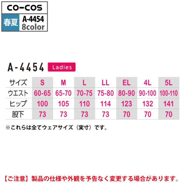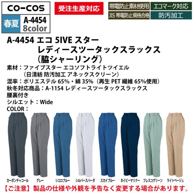 コーコス 作業服 春夏用 A-4454 エコ5IVEスターレディースツータックスラックス(脇シャーリング) EL