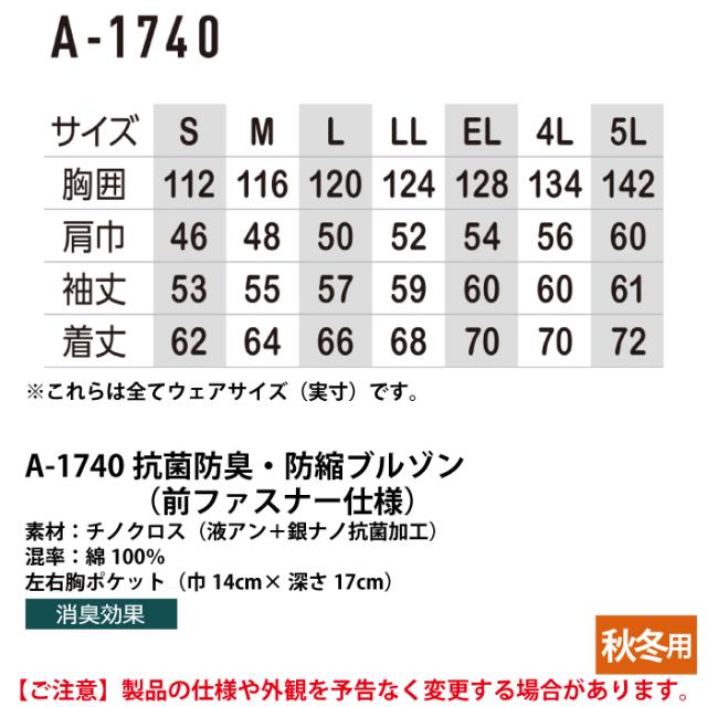 コーコス 作業服 秋冬用 A-1740 抗菌防臭防縮ブルゾン(前ファスナー仕様) S-LL