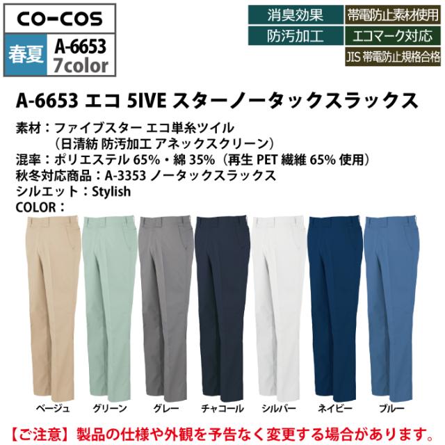 コーコス 作業服 春夏用 A-6653 エコ5IVEスターノータックスラックス 110-125