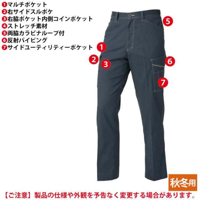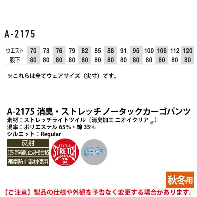 コーコス 作業服 秋冬用 A-2175 消臭ストレッチノータックカーゴパンツ 112-120