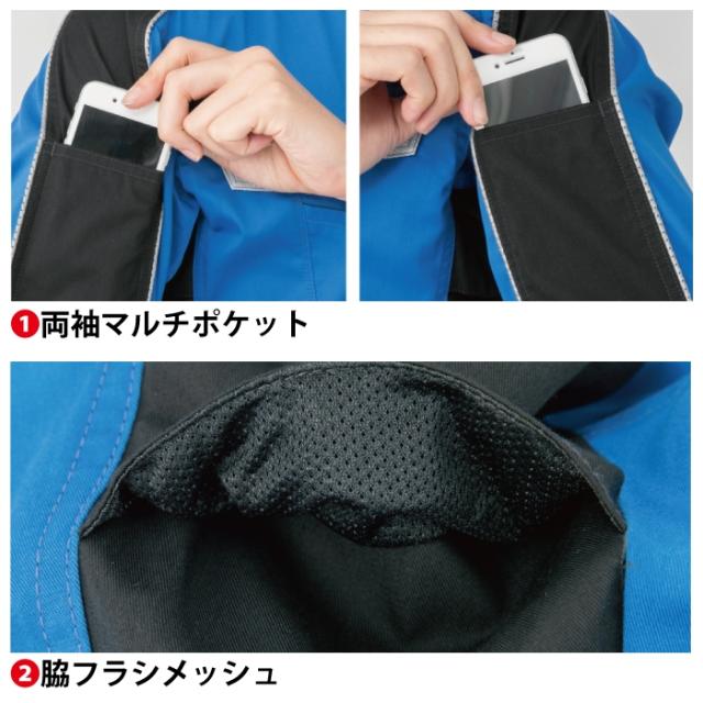 ◇帯電防止素材使用・両袖マルチポケット・脇フラシメッシュ・ペットボトルも入る脇マルチポケット(ペットボトルは形状によります。SS・Sには入りません。)・ストレッチ素材・反射素材(胸・肩袖ライン)・野帳も入る深めのポケット・左胸IDカードループ・タブレットも入る内ポケット(10.1インチまで)・樹脂ドットボタン・樹脂ファスナー・男女兼用