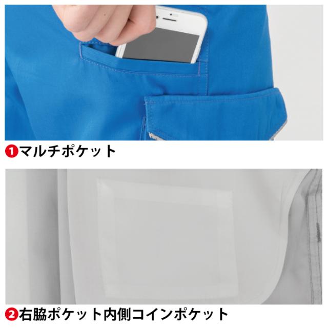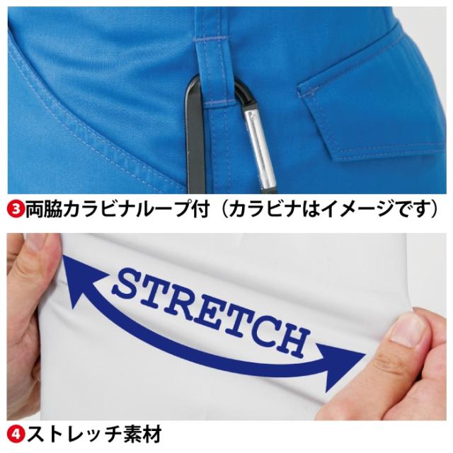 ◇帯電防止素材使用・マルチポケット・右脇ポケット内側コインポケット・両脇カラビナループ付・ストレッチ素材・樹脂穴ボタン(フロント)・樹脂ドットボタン(左後ろポケット)