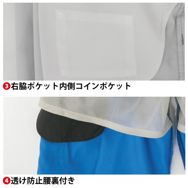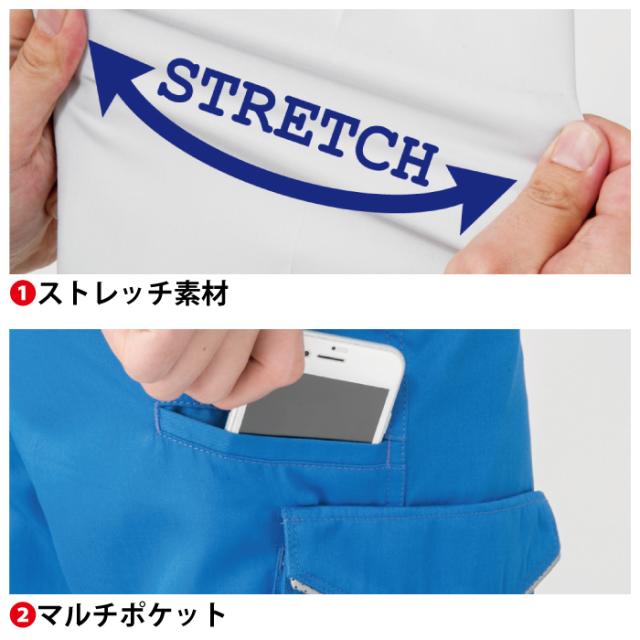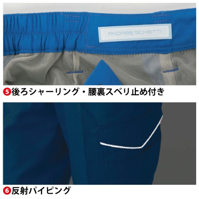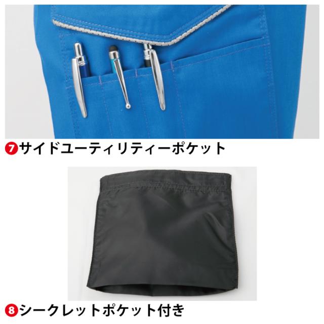 ◇帯電防止素材使用・マルチポケット・右脇ポケット内側コインポケット・ストレッチ素材・後ろシャーリング・腰裏スベリ止め付き・透け防止腰裏付き・反射パイピング・サイドユーティリティーポケット・シークレットポケット付き・樹脂穴ボタン(フロント)・樹脂ドットボタン(左後ろ・サイドポケット)・カラビナループ付