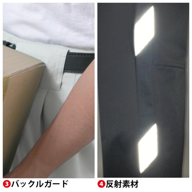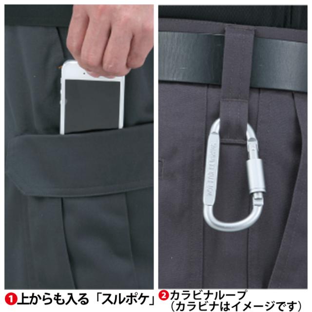 ◇帯電防止素材使用・上からも入る「スルポケ」・カラビナループ・バックルガード・反射素材・樹脂穴ボタン・男女兼用