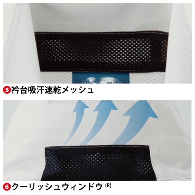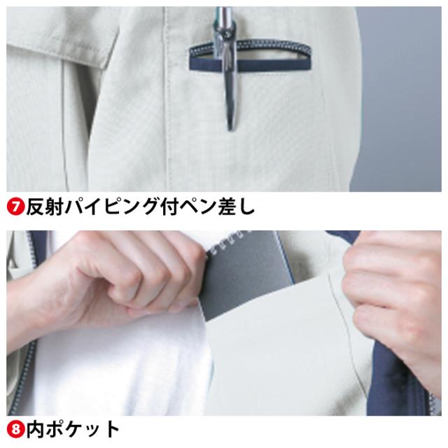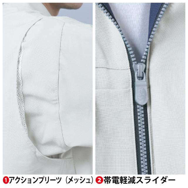 ◇JIS帯電防止規格合格・エコマーク対応・帯電防止素材使用・アクションプリーツ(メッシュ)・帯電軽減スライダー・携帯電話収納ポケット・脇逆玉縁ポケット・衿台吸汗速乾メッシュ・クーリッシュウインドウ・反射パイピング付ペン差し・内ポケット・樹脂ドットボタン・樹脂ファスナー・男女兼用