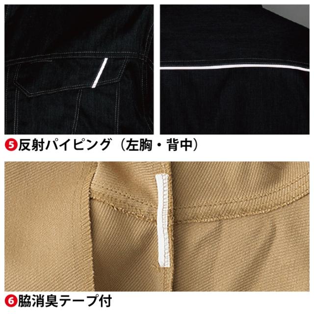 ◇JIS帯電防止規格合格・帯電防止素材使用・長財布も入る右胸ポケット・両袖マルチポケット・脇逆玉大容量ポケット・腕を上げても裾が上がりにくい裾アジャスター・反射パイピング(左胸・背中)・脇消臭テープ付・左胸IDカードループ・野帳も入る縦ポケット・樹脂ドットボタン・樹脂ファスナー・男女兼用