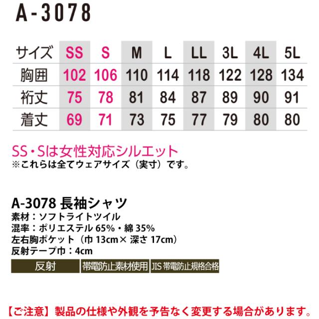 コーコス 作業服 秋冬用 A-3078 長袖シャツ 3L