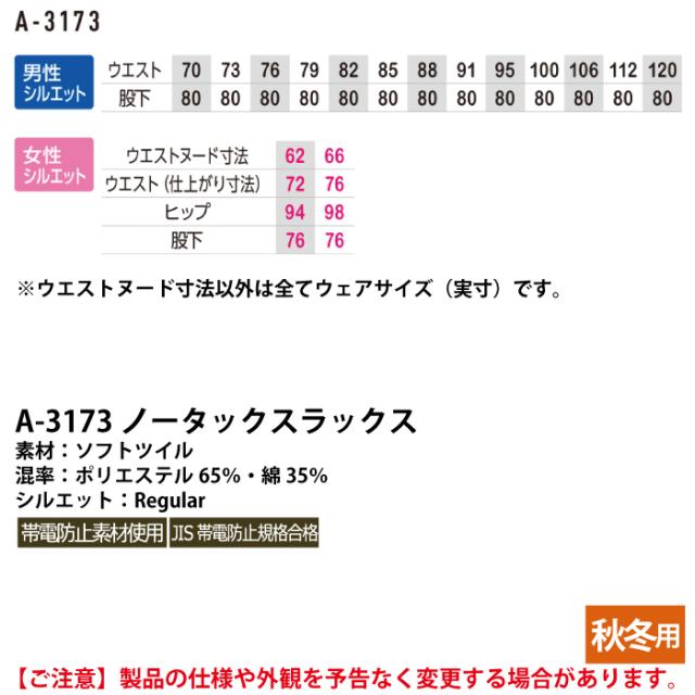 コーコス 作業服 秋冬用 A-3173 ノータックスラックス 62-85