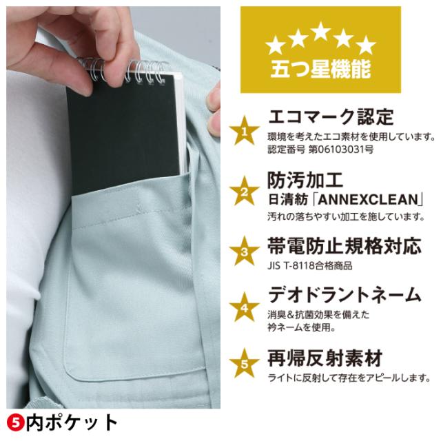 ◇エコマーク認定 防汚加工 JIS帯電防止規格対応 帯電防止素材使用 カラビナループ 内玉ポケット 再帰反射素材 アネックスクリーン 消臭効果 抗菌効果