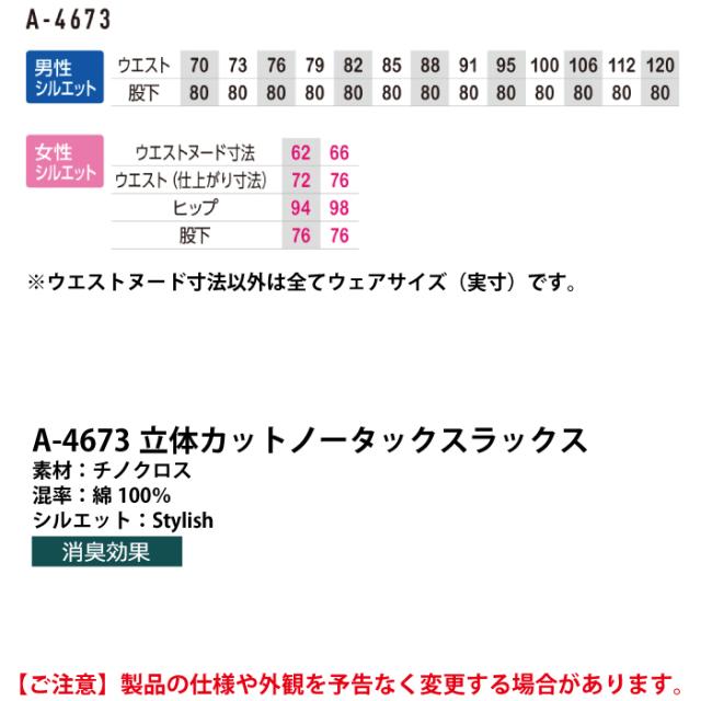 コーコス 作業服 秋冬用 A-4673 立体カットノータックスラックス 62-85