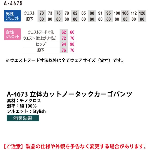 コーコス 作業服 秋冬用 A-4675 立体カットノータックカーゴパンツ 88-106