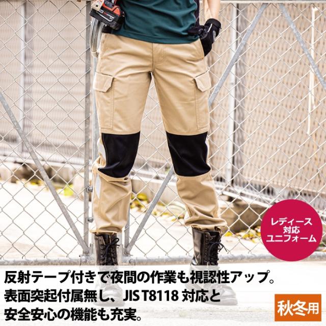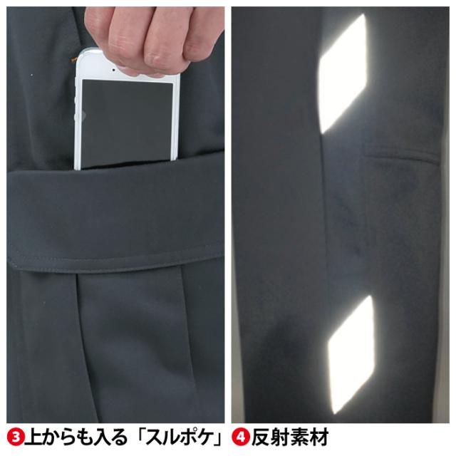 ◇JIS帯電防止規格合格 帯電防止素材使用 両脇カラビナループ付 上からも入る「スルポケ」 反射素材 バックルガード 樹脂穴ボタン