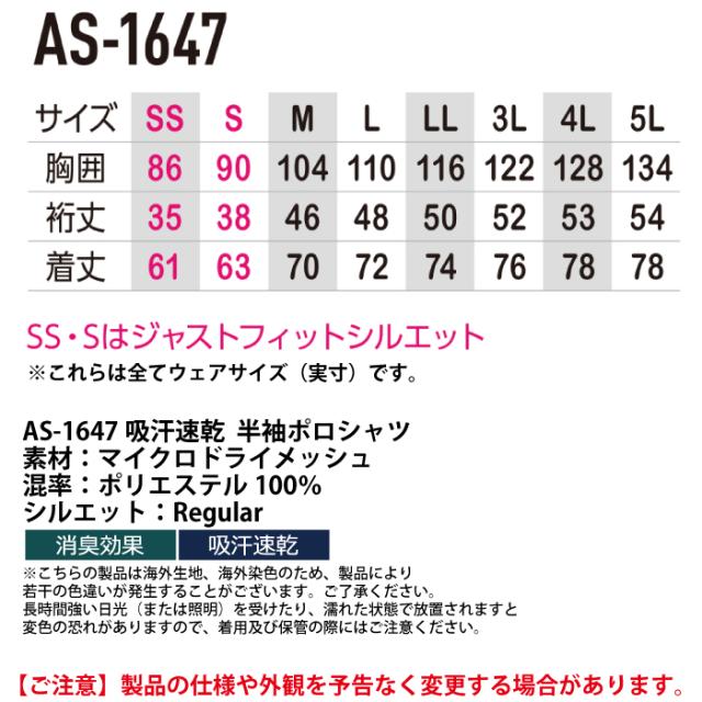 【AS-1647 吸汗速乾半袖ポロシャツ】