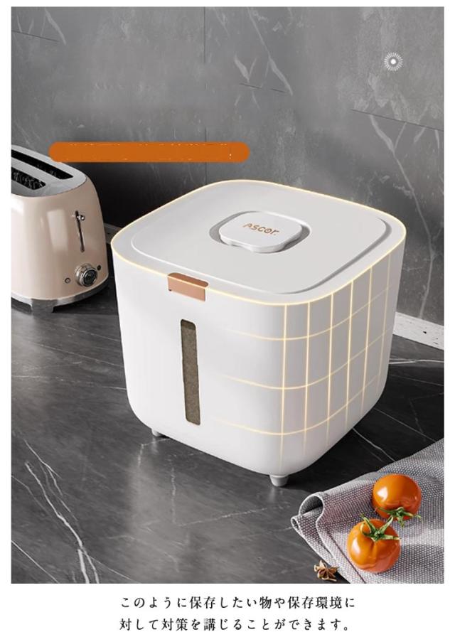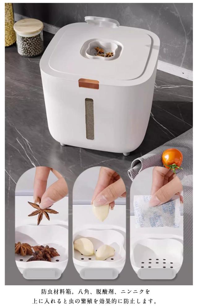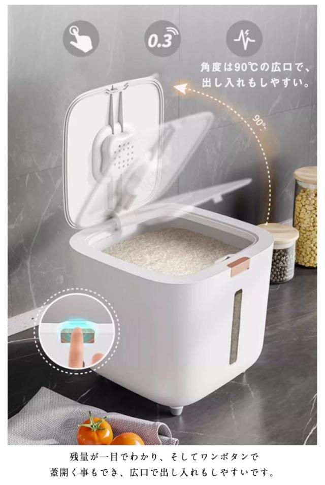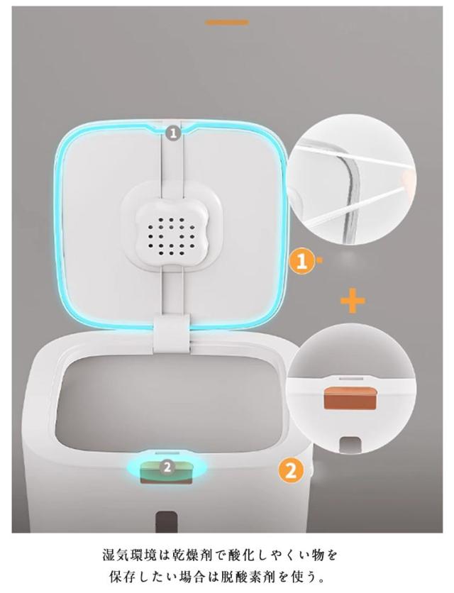 | シンプルだけと、高級感が出ます。モダンなキチンに雰囲気ぴったり!米びつ。 残量が一目でわかり、そしてワンボタンで蓋開く事もでき、広口で出し入れもしやすいです。 湿気環境は乾燥剤で酸化しやくい物を保存したい場合は脱酸素剤を使う。 防虫材料箱。八角、脱酸剤、ニンニクを上に入れると虫の繁殖を効果的に防止します。 このように保存したい物や保存環境に対して対策を講じることができます。 角度は90℃の広口で、出し入れもしやすい。 | |