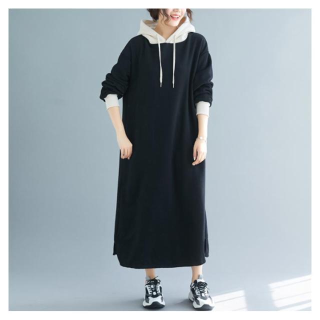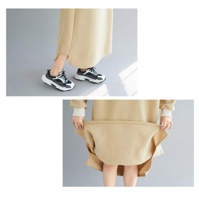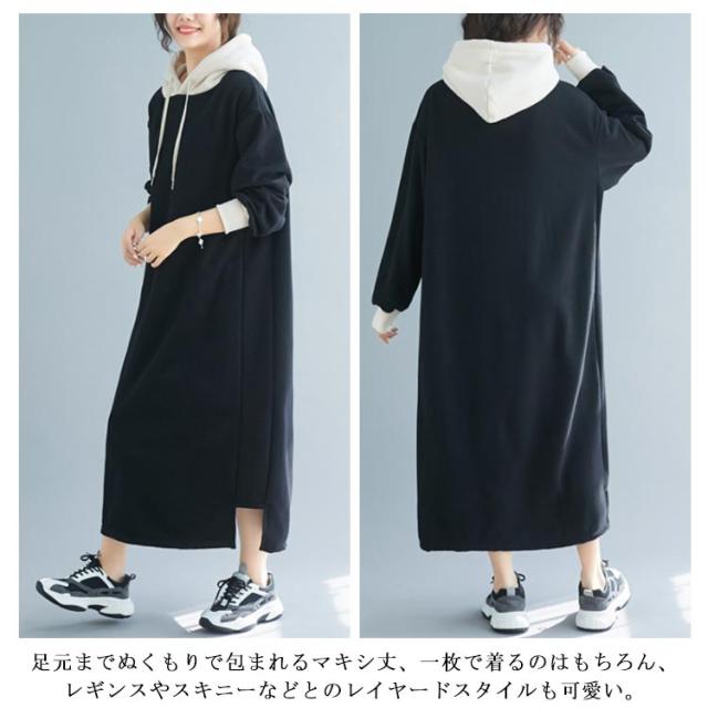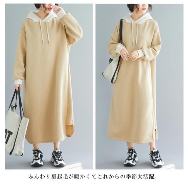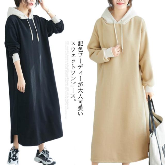 スウェットワンピース 裏起毛 配色 フーディー プルオーバー パーカーワンピース オーバーサイズ スリット ロングワンピ マキシ丈 暖かさ 春秋冬