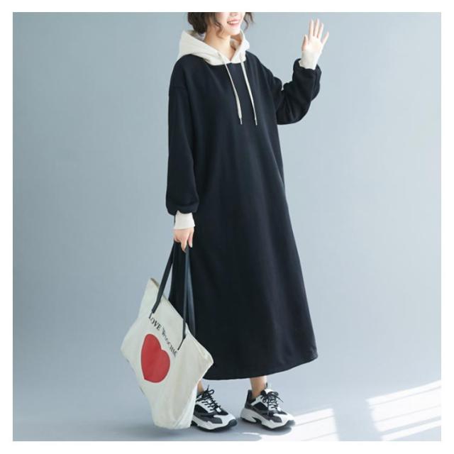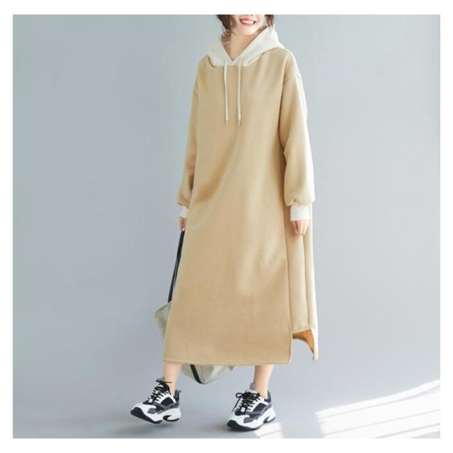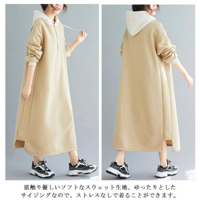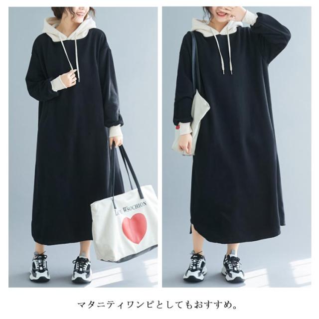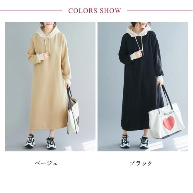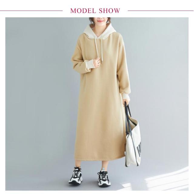 | 配色フーディーが大人可愛いスウェットワンピース。 ふんわり裏起毛が暖かくてこれからの季節大活躍。 肌触り優しいソフトなスウェット生地、ゆったりとしたサイジングなので、ストレスなしで着ることができます。マタニティワンピとしてもおすすめ。 足元までぬくもりで包まれるマキシ丈、一枚で着るのはもちろん、レギンスやスキニーなどとのレイヤードスタイルも可愛い。 | |