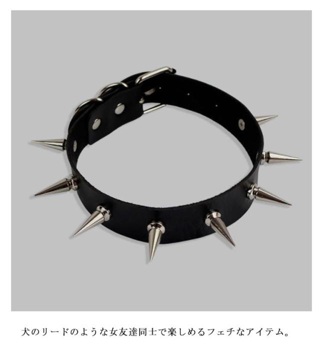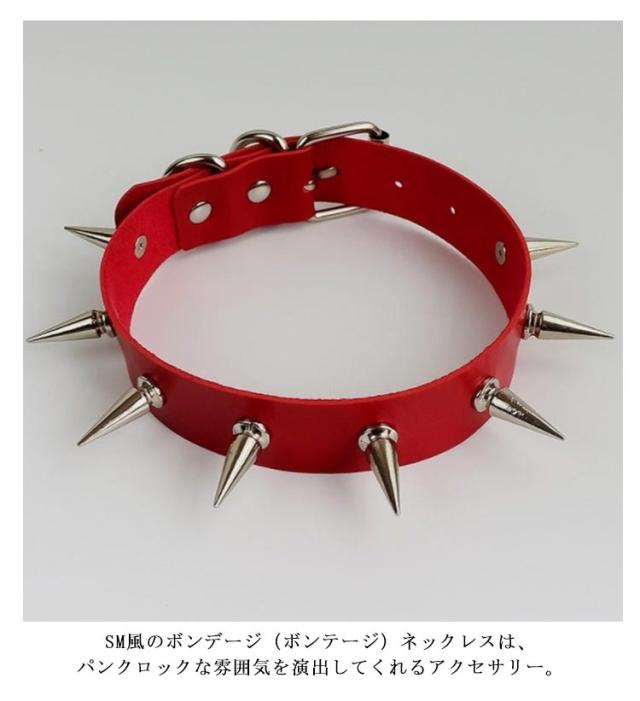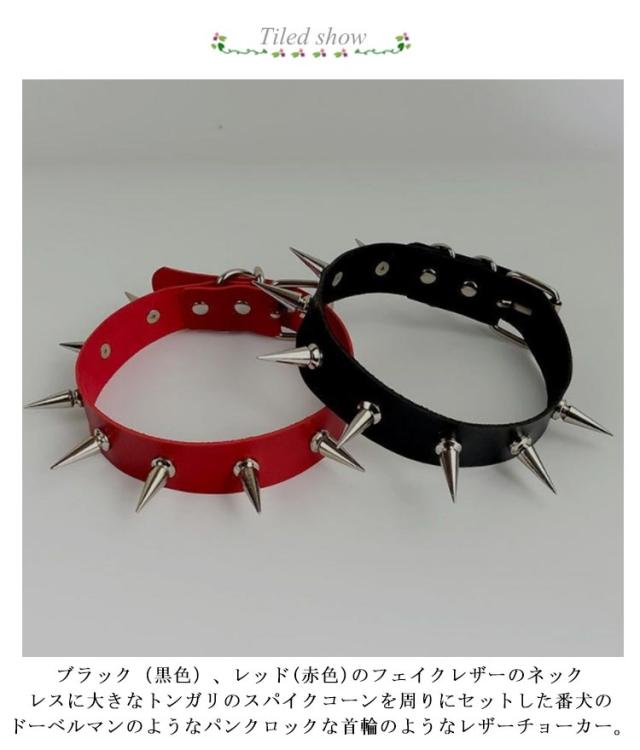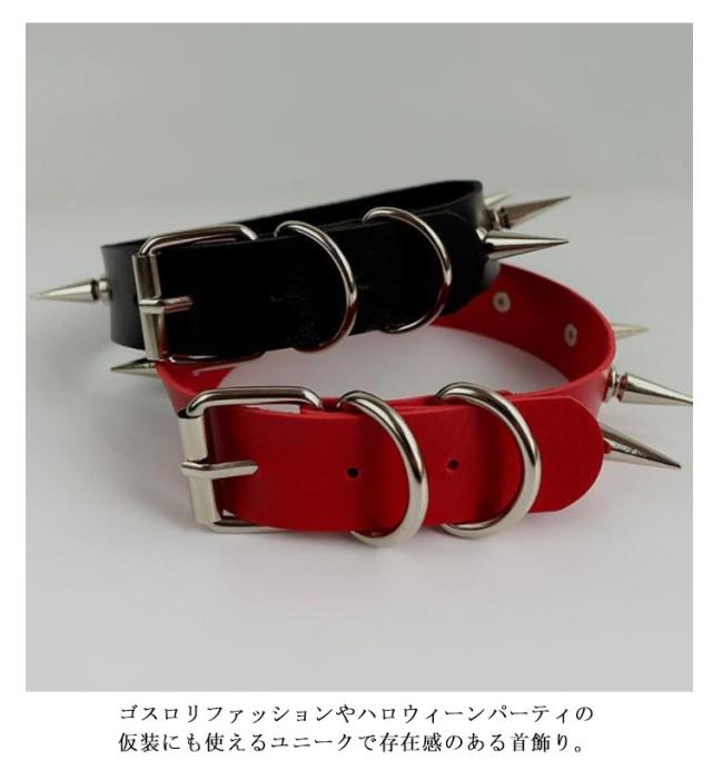 番犬スパイク 首ベルト ゴシック 送料無料 ボンデージ風 フェイクレザーチョーカー ブラック 黒色 コスプレ ブラック レッド フィット 赤色 首に巻く SM風 タイト レディース モデル 首飾り 仮装 オモシロ ラリエット風 ワッカ 輪 首輪 リード コーン トンガリ ネックレス