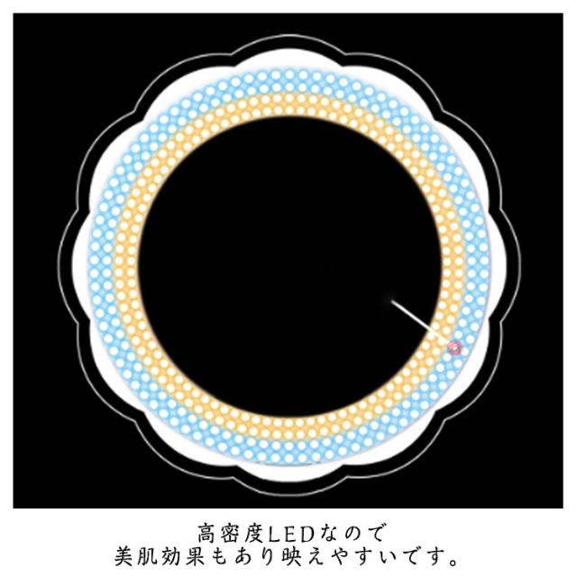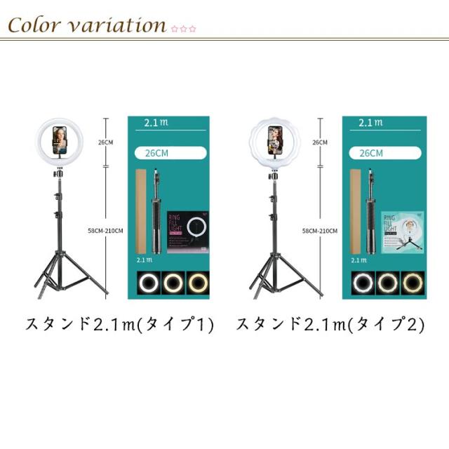 | 直径26cmの大きなライトでしっかり照らします。 高密度LEDなので美肌効果もあり映えやすいです。 昼白色、昼光色、電球色の3種類の光で選択ができます。 向きと明るさも調整できます。 スタンドの高さは58cmから210cmまで調整可能。 スタンドはコンパクトに折りたたみ可能で携帯も便利。 | |