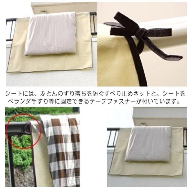 | ベランダなどの汚れからふとんを守るシートです。 サイズ160m*240cm大きさです。 シートには、ふとんのずり落ちを防ぐすべり止めネットと、シートをベランダ手すり等に固定できるテープファスナーが付いています。 ベランダの手すりなどにすべり止めネットがあたるようにシートをかけると、ふとんがずり落ちません。 固定テープでシート自体をベランダ手すりなどに固定できます。 シートの保管に便利な収納袋付です。 | |