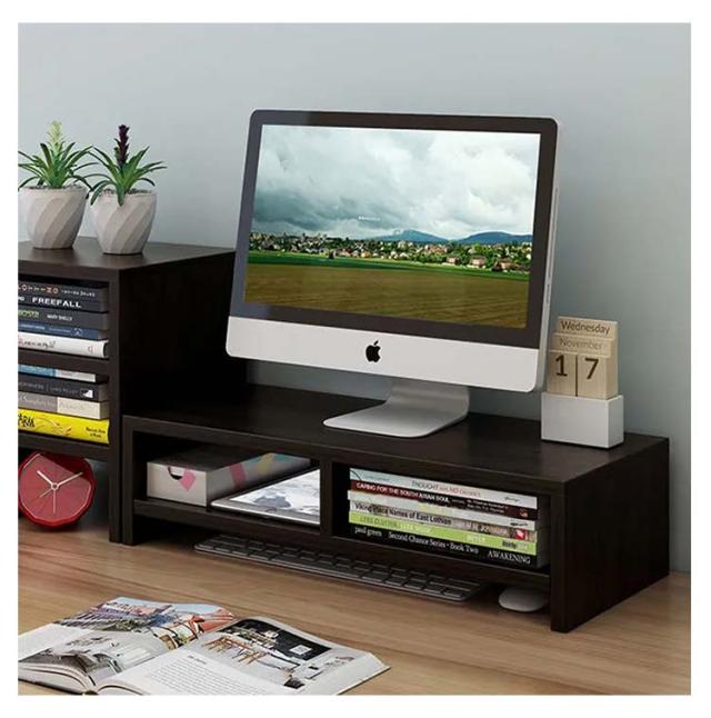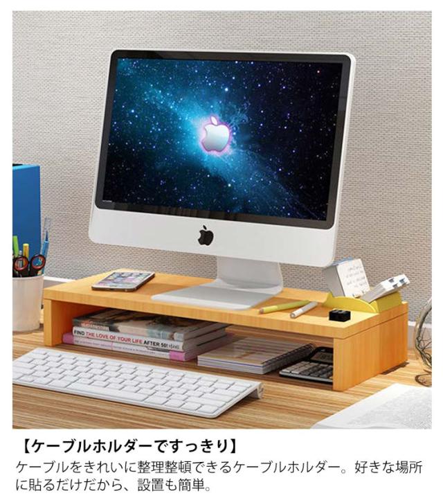 | 棚板付きモニター台で快適な作業環境に! 【棚板付きで収納力をUP!作業スペースをより広く】 デスク周りの小物を収納できる棚付きだから、デスクをすっきり整えより広々と使えます。収納棚は取り出しやすいオープンタイプ。出し入れの多い小物や、書類等の収納にぴったりです。 【目線を上げて、姿勢を改善】 モニターを適切な高さにすれば、首や肩の負担が軽くなります。背筋も伸びて自然と美しい姿勢に。 【ウェブカメラ越しでも顔や表情がスッキリと映る】 やや高いアングルからだと、顔がスッキリ明るく映ります。テレワークやオンライン授業でも、カメラ映えするポジションに。 【ケーブルホルダーですっきり】 ケーブルをきれいに整理整頓できるケーブルホルダー。好きな場所に貼るだけだから、設置も簡単。 | |