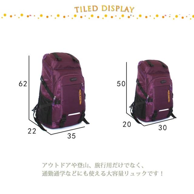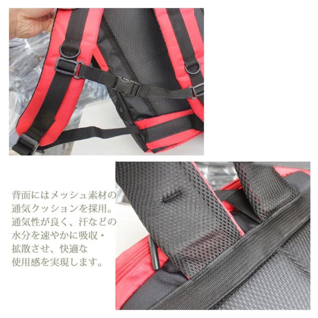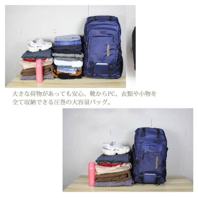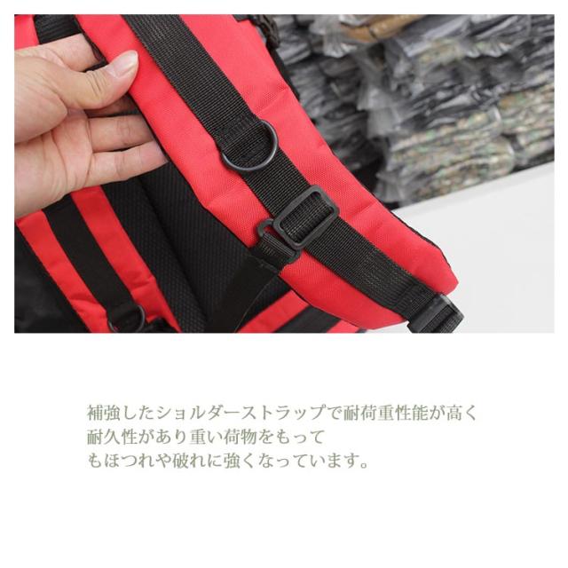 | 背面にはメッシュ素材の通気クッションを採用。通気性が良く、汗などの水分を速やかに吸収・拡散させ、快適な使用感を実現します。 大きな荷物があっても安心、靴からPC、衣類や小物を全て収納できる圧巻の大容量バッグ。 補強したショルダーストラップで耐荷重性能が高く耐久性があり重い荷物をもってもほつれや破れに強くなっています。 撥水加工がされた防水のリュックサック多少の雨であれば水を弾く撥水性。 アウトドアや登山、旅行用だけでなく、通勤通学などにも使える大容量リュックです! | |