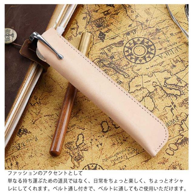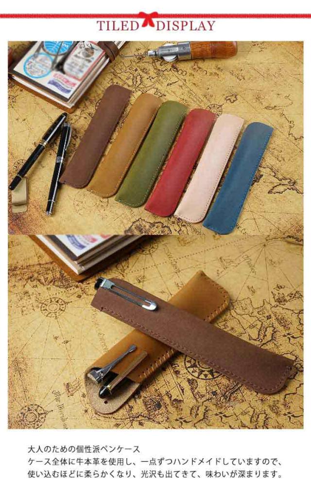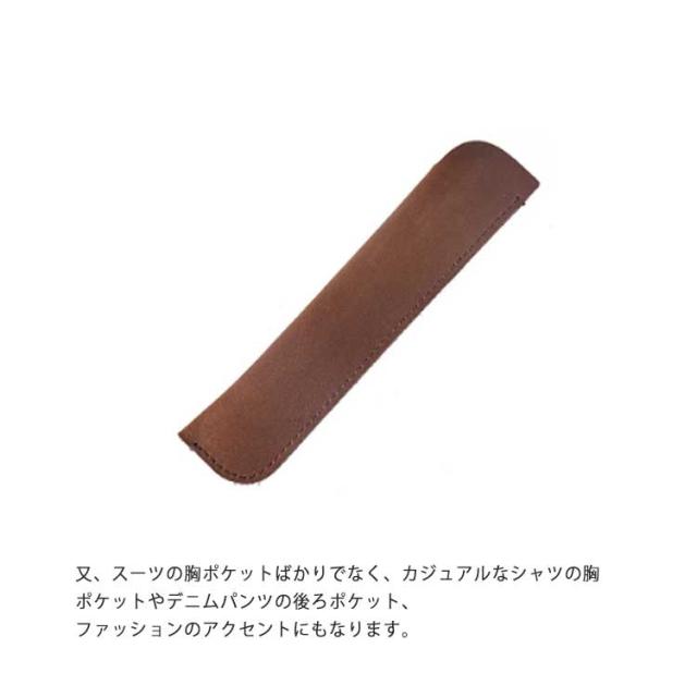 | 大人のための個性派ペンケース ケース全体に牛本革を使用し、一点ずつハンドメイドしていますので、使い込むほどに柔らかくなり、光沢も出てきて、味わいが深まります。 ファッションのアクセントとして 単なる持ち運ぶための道具ではなく、日常をちょっと楽しく、ちょっとオシャレにしてくれます。ベルト通し付きで、ベルトに通してもご使用いただけます。又、スーツの胸ポケットばかりでなく、カジュアルなシャツの胸ポケットやデニムパンツの後ろポケット、ファッションのアクセントにもなります。 いつものかばんをリメイク バッグの中に入れて使用すれば入れ替える時もスムーズ、さらに外ポケットに入れれば、普段のバッグをアレンジしたような新鮮さを味わえます。 | |