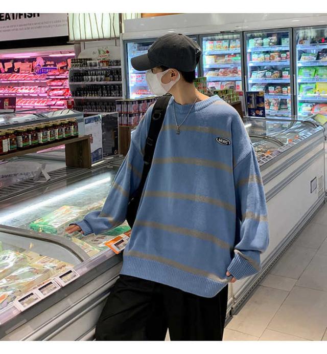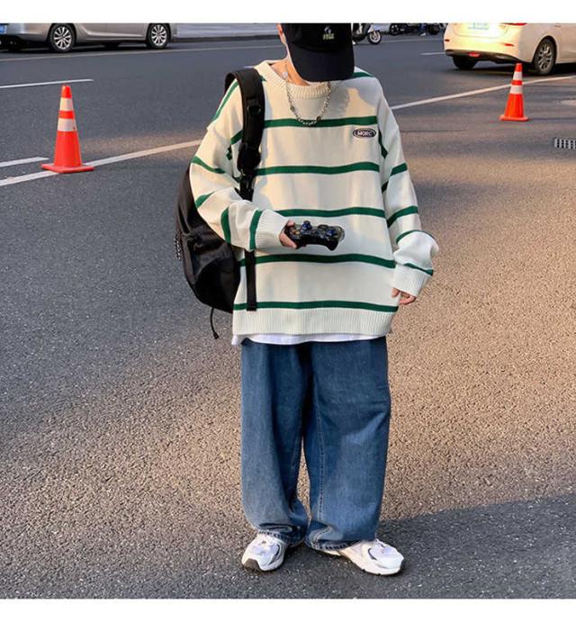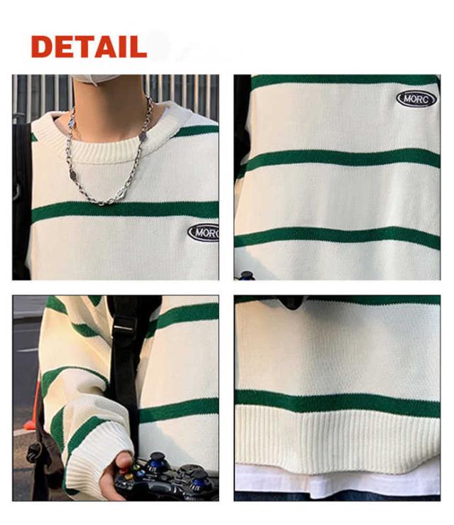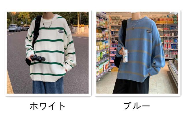 ニット セーター プルオーバー メンズ 学生 ルーズ オーバーサイズ アウターウェア ラウンドネック 秋 冬 長袖 ストライプ スクールセーター