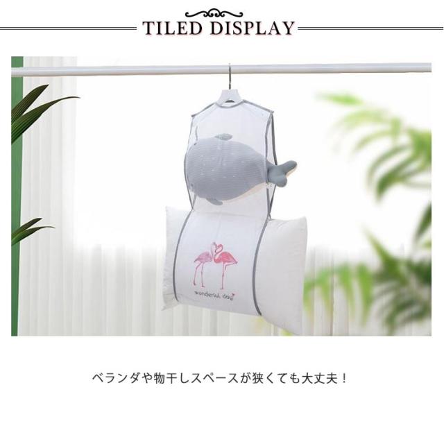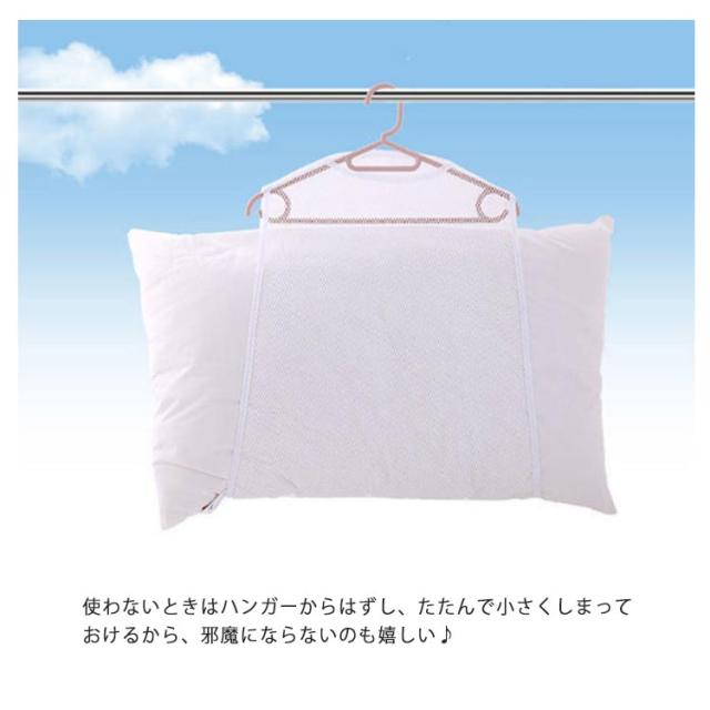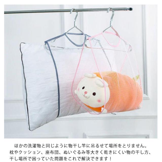 | 枕干しネット ベランダや物干しスペースが狭くても大丈夫! ほかの洗濯物と同じように物干し竿に吊るせて場所をとりません。 両サイドに開口部があり、まくらの出し入れも簡単! 枕やクッション、座布団、ぬいぐるみ等大きく乾きにくい物の干し方、干し場所で困っていた問題をこれで解決できます! 一重で強度のあるハチの巣型メッシュ構造の生地だから、安定して長期間ほつれ無く使えす。 洗い物に接する面積が少なく、採光性・通気性も高いので、効率よく水分を蒸発させることができます。 使いたい時に、ご家庭にある普通のハンガーに取り付けるだけ! 使わないときはハンガーからはずし、たたんで小さくしまっておけるから、邪魔にならないのも嬉しい♪ | |